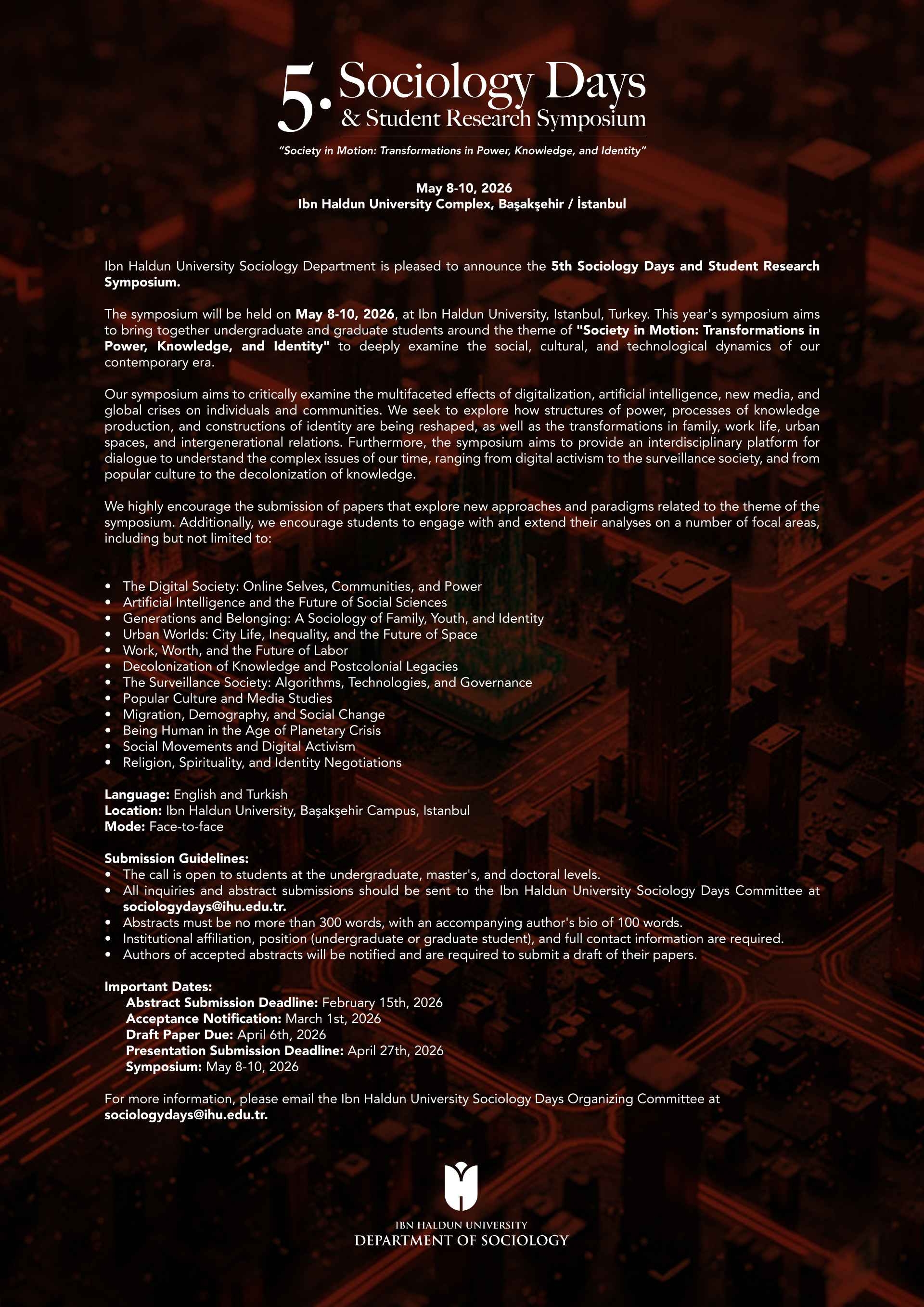 The symposium will be held on May 8-10, 2026, at Ibn Haldun University, Istanbul, Turkey. This year's symposium aims to bring together undergraduate and graduate students around the theme of "Society in Motion: Transformations in Power, Knowledge, and Identity" to deeply examine the social, cultural, and technological dynamics of our contemporary era.