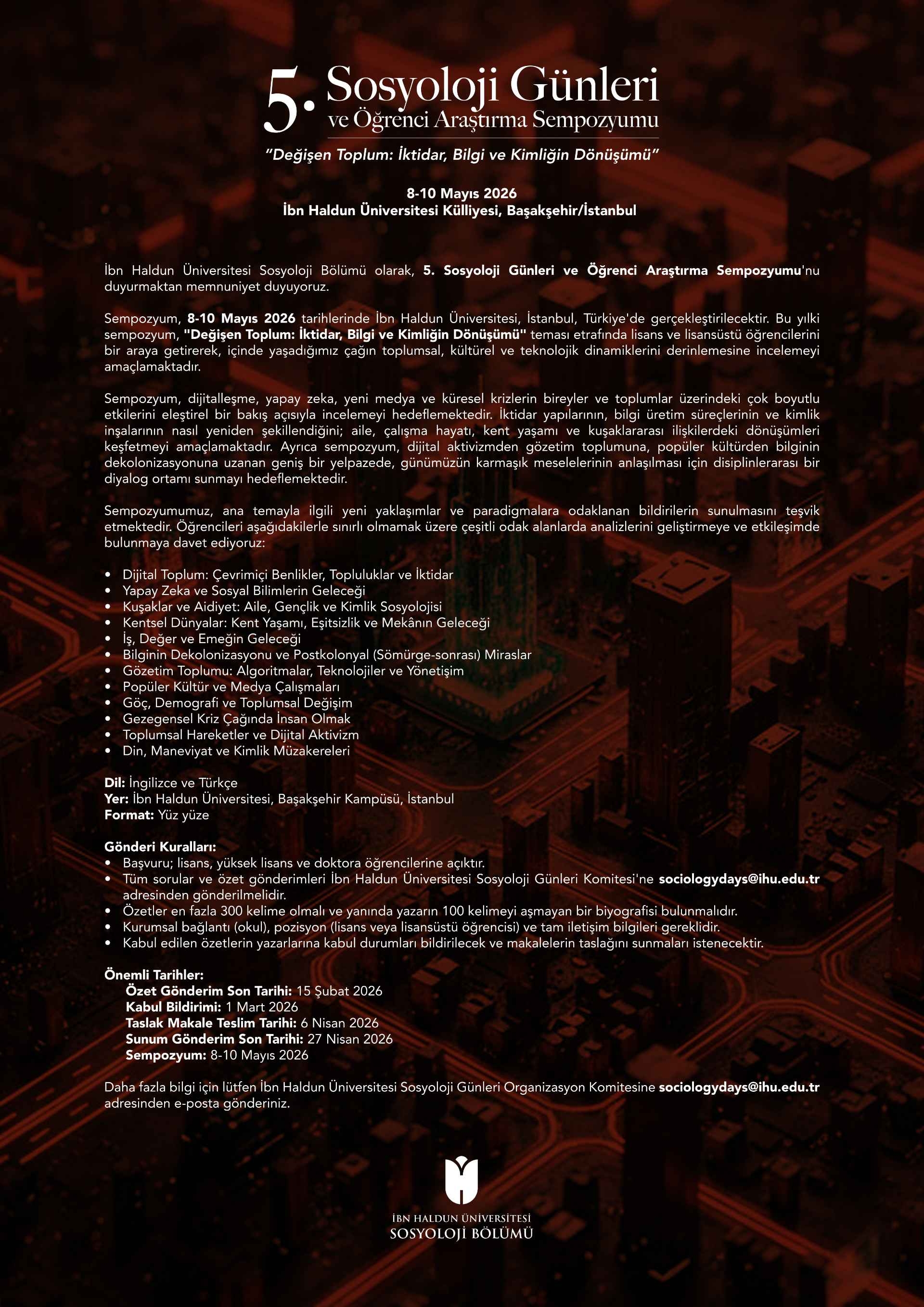 All inquiries and abstract submissions should be sent to the Ibn Haldun University Sociology Days Committee at sociologydays@ihu.edu.tr.